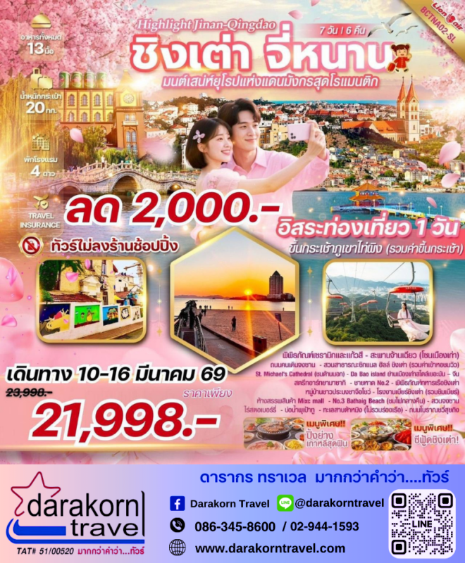 โปรไฟไหม้ ทัวร์จีน ชิงเต่า จี่หนาน 7วัน6คืน โปรแรง ลดราคา 2000 บาท จองด่วน Posted on March 4, 2026 by Sales Darakorn Travel 04 Mar ทัวร์จีน ชิงเต่า จี่หนาน 7วัน6คืน โปรแรง ลดราคา 2000 บาท จองด่วน สะพานจ้านเฉียว ชายหาด NO.2 โรงงานเบียร์ชิงเต่า บ่อน้ำพุเป้าทู ทะเลสาบต้าหมิง วันเดินทาง 10-16 มี.ค.69 จากราคา 23,998.- เหลือเพียง 21,998.- Facebook iconFacebookTwitter iconTwitterLINE iconLine Sales Darakorn Travel ทัวร์ญี่ปุ่น โอซาก้า นาโกย่า ทาคาย่ามา 6วัน4คืน โปรแรง ลดราคา 4000 บาท จองด่วน