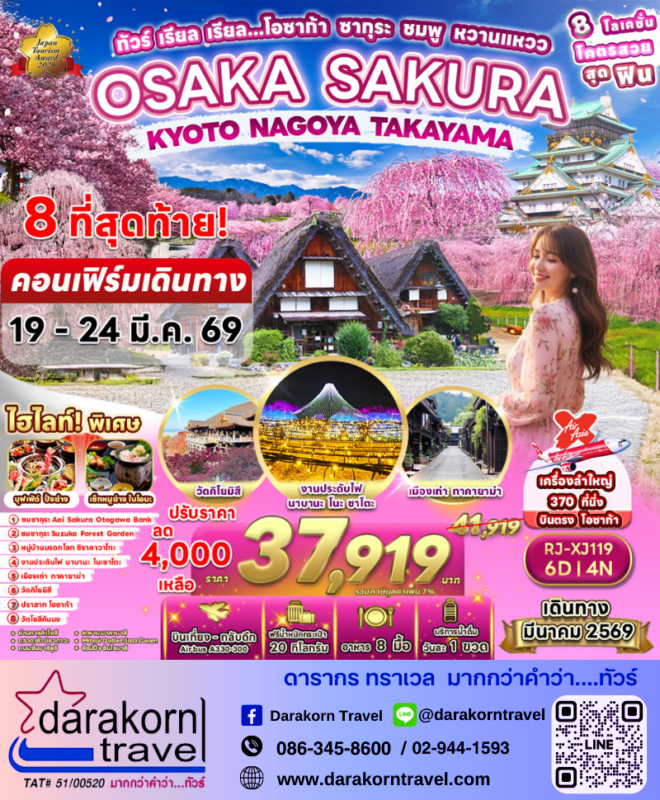 โปรไฟไหม้ ทัวร์ญี่ปุ่น โอซาก้า นาโกย่า ทาคาย่ามา 6วัน4คืน โปรแรง ลดราคา 4000 บาท จองด่วน Posted on March 4, 2026 by Sales Darakorn Travel 04 Mar ทัวร์ญี่ปุ่น โอซาก้า นาโกย่า ทาคาย่ามา 6วัน4คืน โปรแรง ลดราคา 4000 บาท จองด่วน วัดคิโยมิสึ งานประดับไฟ นาบานะ โนะ ซาโตะ เมืองเก่าทาคายาม่า ปราสาทโอซาก้า หมู่บ้านชิราคาวาโกะ วันเดินทาง 19 – 24 มี.ค.69 จากราคา 41,919.- เหลือเพียง 37,919.- Facebook iconFacebookTwitter iconTwitterLINE iconLine Sales Darakorn Travel ทัวร์ไต้หวัน ไทจง จีหลง ไทเป เกาะเหอผิง ชมดอกไม้ เหย่หลิว 4วัน3คืน โปรแรง ลดราคา 8000 บาท จองด่วน ทัวร์จีน ชิงเต่า จี่หนาน 7วัน6คืน โปรแรง ลดราคา 2000 บาท จองด่วน