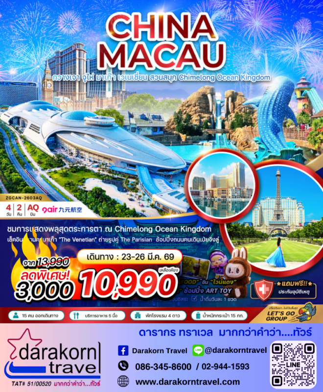 ทัวร์จีน มาเก๊า จู่ไห่ เวเนเชี่ยน สวนสนุก Chimelong Ocean Kingdom 4วัน2คืน โปรแรง ลดราคา 3,000 บาท จองด่วน