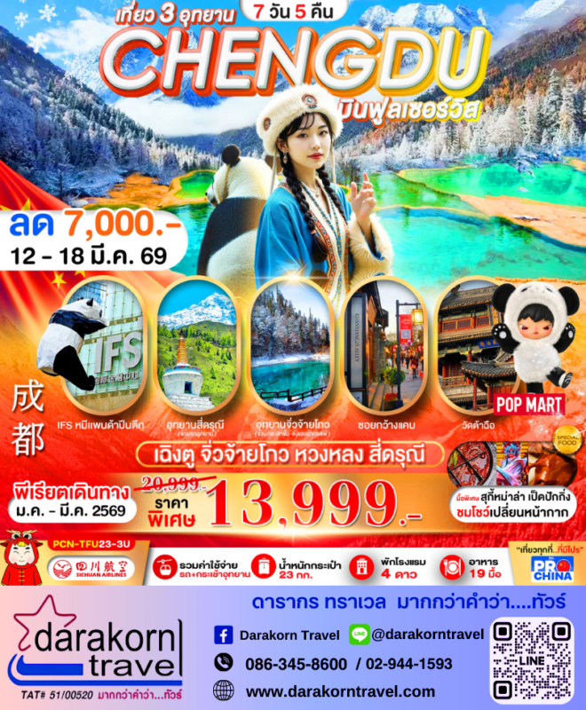 โปรไฟไหม้ ทัวร์จีน เฉิงตู 3อุทยาน 7วัน5คืน โปรแรง ลดราคา 7000 บาท จองด่วน Posted on March 11, 2026March 11, 2026 by Sales Darakorn Travel 11 Mar ทัวร์จีน เฉิงตู 3อุทยาน 7วัน5คืน โปรแรง ลดราคา 7000 บาท จองด่วน อุทยานสี่ดรุณี อุทยานจิ่วจ้ายโกว ซอยกว้างแคบ วัดต้าฉือ วันเดินทาง 12 – 18 มี.ค.69 จากราคา 20,999.- เหลือเพียง 13,999.- Facebook iconFacebookTwitter iconTwitterLINE iconLine Sales Darakorn Travel ทัวร์จีน บินฟลูเซอร์วิส เฉิงตู 6วัน5คืน โปรแรง ลดราคา 9000 บาท จองด่วน