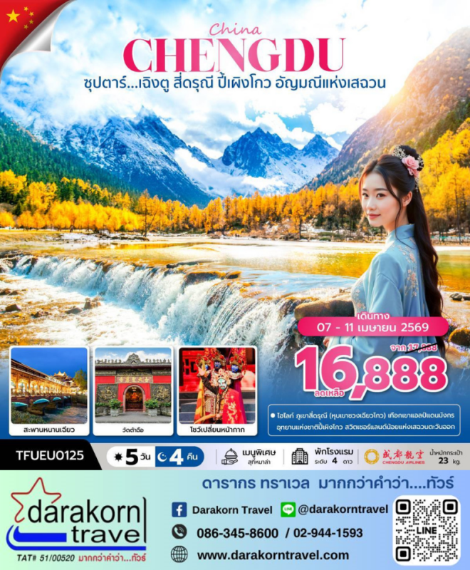 โปรไฟไหม้ ทัวร์จีน เฉิงตู สี่ดรุณี ปี้เผิงโกว 5วัน4คืน โปรแรง ลดราคา 1000 บาท จองด่วน Posted on March 18, 2026 by Sales Darakorn Travel 18 Mar ทัวร์จีน เฉิงตู สี่ดรุณี ปี้เผิงโกว 5วัน4คืน โปรแรง ลดราคา 1000 บาท จองด่วน อุทยานสี่ดรุณี อุทยานแห่งชาติปี้เผิงโกว โชว์เปลี่ยนหน้ากาก วัดต้าฉือ สะพานหนานเฉียว วันเดินทาง 07 – 11 เม.ย.69 จากราคา 17,888.- เหลือเพียง 16,888.- Facebook iconFacebookTwitter iconTwitterLINE iconLine Sales Darakorn Travel ทัวร์จีน เฉิงตู เหมยซาน ภูเขาหิมะวาวู่ 3วัน2คืน โปรแรง ลดราคา 3000 บาท จองด่วน