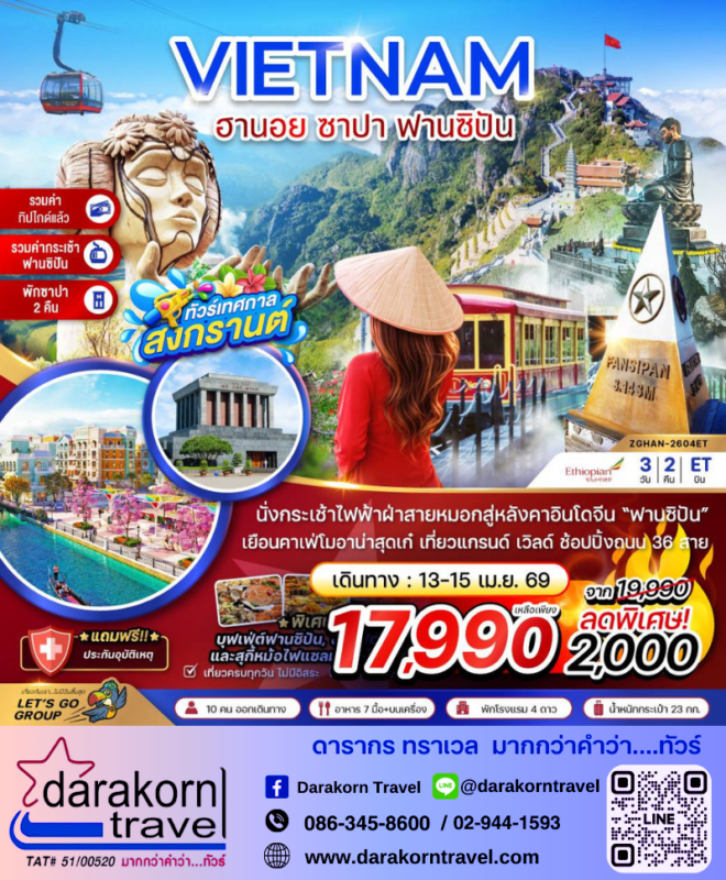 โปรไฟไหม้ ทัวร์เวียดนามเหนือ ฮานอย ซาปา ฟานซิปัน โปรแรง ลดราคา 2000 บาท จองด่วน Posted on March 18, 2026 by Sales Darakorn Travel 18 Mar ทัวร์เวียดนามเหนือ ฮานอย ซาปา ฟานซิปัน โปรแรง ลดราคา 2000 บาท จองด่วน นั่งกระเช้าไฟฟ้าขึ้นฟาซิปัน เยือนคาเฟ่โมอาน่าสุดเก๋ เที่ยวแกรนด์ เวิลด์ ช้อปปิ้งถนน 36 สาย วันเดินทาง 13-15 เม.ย.69 จากราคา 19,990.- เหลือเพียง 17,990.- Facebook iconFacebookTwitter iconTwitterLINE iconLine Sales Darakorn Travel ทัวร์ไต้หวัน ไทเปกับอาลีซาน วันที่ใตๆได้พัก ลดราคา 2000 บาท จองด่วน ทัวร์ตุรกี อิสตันบลู อดานา สวนดอกไม้ทิวลิป โปรแรง ลดราคา 2000 บาท จองด่วน