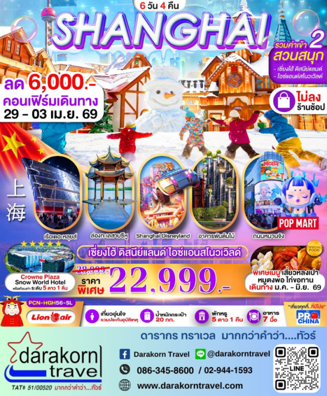โปรไฟไหม้ ทัวร์จีน เซี่ยงไฮ้ ดิสนีย์แลนด์ 6วัน4คืน โปรแรง ลดราคา 6000 บาท จองด่วน Posted on March 20, 2026 by Sales Darakorn Travel 20 Mar ทัวร์จีน เซี่ยงไฮ้ ดิสนีย์แลนด์ 6วัน4คืน โปรแรง ลดราคา 6000 บาท จองด่วน เรือเดอะหลุยส์ ล่องทะเลเรือสาบซีหู เซี่ยงไฮ้ ดิสนีย์แลนด์ อาคารพันต้นไม้ ถนนหนานจิง วันเดินทาง 29 มี.ค. – 03 เม.ย.69 จากราคา 28,999.- เหลือเพียง 22,999.- Facebook iconFacebookTwitter iconTwitterLINE iconLine Sales Darakorn Travel ทัวร์จีน เฉิงตู จูเจียงเอี้ยน อุทยานหุบเขาสี่ดรุณี 4วัน3คืน โปรแรง ลดราคา 2000 บาท จองด่วน ทัวร์จีน เซี่ยงไฮ้ หางโจว ล่องเรือทะเลสาบซีหู อู๋ซี 5วัน3คืน โปรแรง ลดราคา 3000 บาท จองด่วน