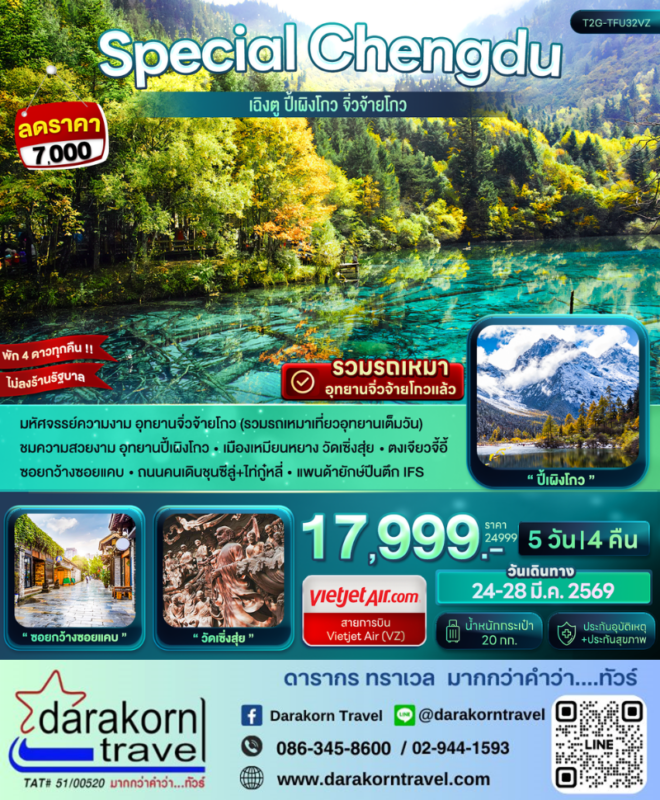 โปรไฟไหม้ ทัวร์จีน เฉิงตู ปี้เผิงโกว จิ่วจ้ายโกว 5วัน4คืน โปรแรง ลดราคา 7000 บาท จองด่วน Posted on March 23, 2026 by Sales Darakorn Travel 23 Mar ทัวร์จีน เฉิงตู ปี้เผิงโกว จิ่วจ้ายโกว 5วัน4คืน โปรแรง ลดราคา 7000 บาท จองด่วน อุทยานปี้เผิงโกว อุทยานจิ่วจ้ายโกว วัดเซิ่งสุ่ย แพนด้าเซลฟี่ ตงเจียวจี้อี้ วันเดินทาง 24 – 28 มี.ค.69 จากราคา 24,999.- เหลือเพียง 17,999.- Facebook iconFacebookTwitter iconTwitterLINE iconLine Sales Darakorn Travel ทัวร์เวียดนาม ฮานอย ลาวไก ซาปา 4วัน3คืน โปรแรง ลดราคา 5000 บาท จองด่วน 6 ที่สุดท้าย
