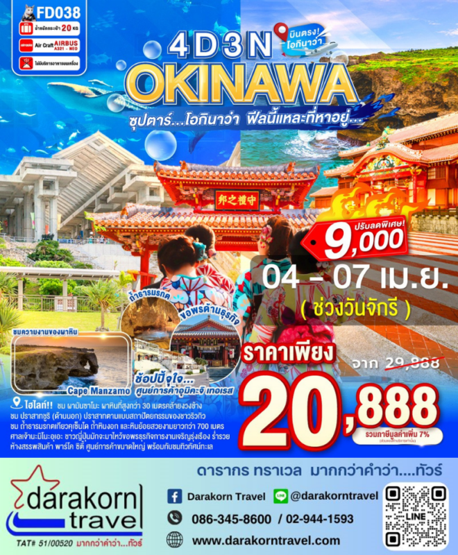 โปรไฟไหม้ ทัวร์ญี่ปุ่น โอกินาว่า ฟีลนี้แหละ 4วัน3คืน โปรแรง ลดราคา 9000 บาท จองด่วน Posted on March 24, 2026 by Sales Darakorn Travel 24 Mar ทัวร์ญี่ปุ่น โอกินาว่า ฟีลนี้แหละ 4วัน3คืน โปรแรง ลดราคา 9000 บาท จองด่วน ชมผามันโซะ ปราสาทซูรี ชมถ้ำธารมรกต ถ้ำหินงอกหินย้อย ศาลเจ้านะมิโนะ วันเดินทาง 04-07 เม.ย.69 จากราคา 29,888.- เหลือเพียง 20,888.- Facebook iconFacebookTwitter iconTwitterLINE iconLine Sales Darakorn Travel ทัวร์ญี่ปุ่น โอซาก้า ทาคายาม่า 6วัน4คืน โปรแรง ลดราคา 4000 บาท จองด่วน