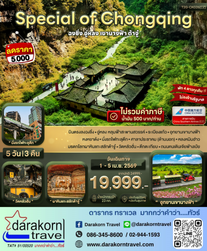 โปรไฟไหม้ ทัวร์จีน Special Of Chongqing 5วัน3คืน โปรแรง ลดราคา 5000 บาท จองด่วน Posted on March 30, 2026 by Sales Darakorn Travel 30 Mar ทัวร์จีน Special Of Chongqing 5วัน3คืน โปรแรง ลดราคา 5000 บาท จองด่วน หลุมฟ้าสะพานสวรรค์ ระเบียงแก้ว อุทยานเขานางฟ้า หงหยาต้ง นั่งระถไฟทะลุตึก ผาหินแกะสลักต้าจู๋ วันเดินทาง 01 – 05 เม.ย.69 จากราคา 24,999.- เหลือเพียง 19,999.- Facebook iconFacebookTwitter iconTwitterLINE iconLine Sales Darakorn Travel ทัวร์ญี่ปุ่น โตเกียว คาวาโกเอะ สปริง 5วัน3คืน โปรแรง ลดราคา 8000 บาท จองด่วน ทัวร์จีน เฉิวตู ต่ากู่ สี่ดรุรี จิวจ่ายโกว 6วัน5คืน โปรแรง ลดราคา 2000 บาท จองด่วน