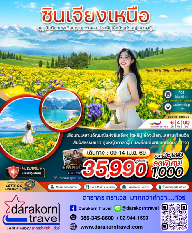 โปรไฟไหม้ ทัวร์จีน ซินเจียงเหนือ เทือกเขาเทียนซาน 6วัน4คืน โปรแรง ลดราคา 1000 บาท จองด่วน Posted on March 31, 2026 by Sales Darakorn Travel 31 Mar ทัวร์จีน ซินเจียงเหนือ เทือกเขาเทียนซาน 6วัน4คืน โปรแรง ลดราคา 1000 บาท จองด่วน เยือนทะเลสาบอัญมณีแห่งซินเจียง ล่องเรือทะเลสาบเทียนฉือ ทุ่งหญ้าคาลาจุ้น ช้อปปิ้งถนนคนเดินทางตาปาจา วันเดินทาง 09 – 14 เม.ย.69 จากราคา 36,990.- เหลือเพียง 35,990.- Facebook iconFacebookTwitter iconTwitterLINE iconLine Sales Darakorn Travel ทัวร์จีน แคชเมียร์ โซนามาร์ค ทิวลิป 6วัน5คืน โปรแรง ลดราคา 8000 บาท จองด่วน 4 ที่สุดท้าย ทัวร์ฮ่องกง กระเช้านองปิง ดิสนีย์แลนด์ รีพัลเบย์ 3วัน2คืน โปรแรง ลดราคา 2000 บาท จองด่วน