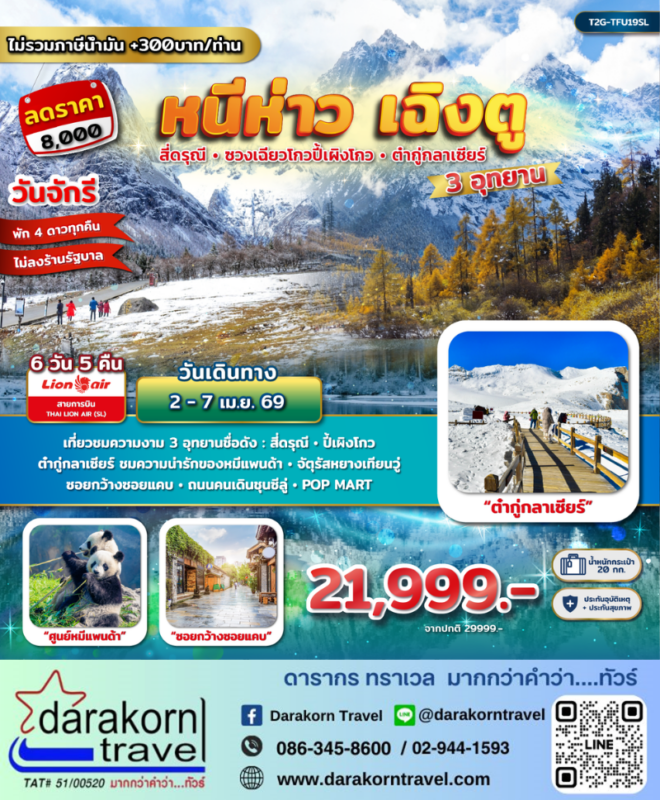 โปรไฟไหม้ ทัวร์จีน หนีห่าว เฉิงตู 6วัน5คืน โปรแรง ลดราคา 8000 บาท จองด่วน Posted on March 31, 2026 by Sales Darakorn Travel 31 Mar ทัวร์จีน หนีห่าว เฉิงตู 6วัน5คืน โปรแรง ลดราคา 8000 บาท จองด่วน อุทยานสี่ดรุณี อุทยานปี้เผิงโกว อุทยานต๋ากู่กลาเซียร์ ซอยกว้างซอยแคบ จตุรัสหยางเทียนวู่ POP MART วันเดินทาง 02-07 เม.ย.69 จากราคา 29,999.- เหลือเพียง 21,999.- Facebook iconFacebookTwitter iconTwitterLINE iconLine Sales Darakorn Travel ทัวร์ญี่ปุ่น โตเกียว โทยามะ ฟูจิซากุระ 6วัน4คืน โปรแรง ลดราคา 3000 บาท จองด่วนฟรีพักเดี่ยว ทัวร์จีน แคชเมียร์ โซนามาร์ค ทิวลิป 6วัน5คืน โปรแรง ลดราคา 8000 บาท จองด่วน 4 ที่สุดท้าย
