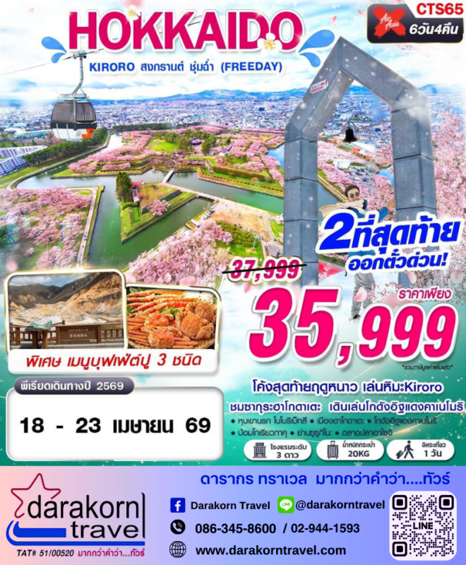 โปรไฟไหม้ ทัวร์จีน ฮอกไกโด คิโรโระ สงกรานต์ ชุ่มฉ่ำ 6วัน4คืน โปรแรง ลดราคา 2000 บาท จองด่วน Posted on April 2, 2026 by Sales Darakorn Travel 02 Apr ทัวร์จีน ฮอกไกโด คิโรโระ สงกรานต์ ชุ่มฉ่ำ 6วัน4คืน โปรแรง ลดราคา 2000 บาท จองด่วน ชมซากุระ ชมวิวโตเกียวสกายทรี เดินเล่นทิวลิปสวนโชวะ คิเนน วัดมัตสึจิยามะ แม่น้ำเมกุโระ หมู่บ้านน้ำใส วันเดินทาง 18-23 เม.ย.69 จากราคา 37,999.- เหลือเพียง 35,999.- Facebook iconFacebookTwitter iconTwitterLINE iconLine Sales Darakorn Travel ทัวร์จีน โตเกียว ทิวลิปฉ่ำว้าว 5วัน3คืน โปรแรง ลดราคา 4000 บาท จองด่วน ทัวร์จีน โอซาก้า ลั้นลา 5วัน3คืน โปรแรง ลดราคา 4000 บาท จองด่วน