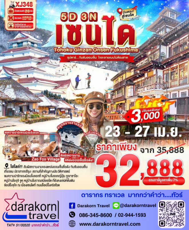 โปรไฟไหม้ ทัวร์ญี่ปุ่น เซนได ออนเซน ฟุกุชิมา 5วัน3คืน โปรแรง ลดราคา 3000 บาท จองด่วน Posted on April 7, 2026 by Sales Darakorn Travel 07 Apr ทัวร์ญี่ปุ่น เซนได ออนเซน ฟุกุชิมา 5วัน3คืน โปรแรง ลดราคา 3000 บาท จองด่วน ZAO FOX VILLAGE สนุกสนานลานสกี ภูเขาซาโอะ หมู่บ้านโออุจิ ช้อปปิ้งจุใจ ณ เมืองเซนได วันเดินทาง 23-27 เม.ย.69 จากราคา 35,888.- เหลือเพียง 32,888.- Facebook iconFacebookTwitter iconTwitterLINE iconLine Sales Darakorn Travel ทัวร์ญี่ปุ่น ฮอกไกโด โทยะ โอตารุ 5วัน3คืน โปรแรง ลดราคา 3000 บาท จองด่วนฟรีพักเดี่ยว ทัวร์จีน เฉิงตู พักในอุทยานหุบเขาสี่ดรุณี 1คืน 4วัน2คืน โปรแรง ลดราคา 1000 บาท จองด่วน