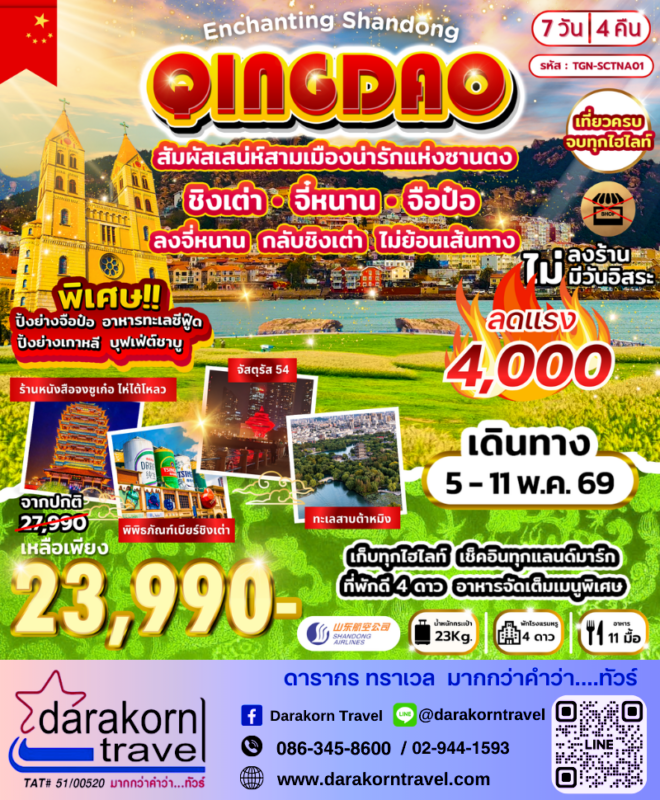 โปรไฟไหม้ ทัวร์จีน ชิงเต่า จี๋หนาน จือปอ 7วัน4คืน โปรแรง ลดราคา 4000 บาท จองด่วน Posted on April 16, 2026 by Sales Darakorn Travel 16 Apr ทัวร์จีน ชิงเต่า จี๋หนาน จือปอ 7วัน4คืน โปรแรง ลดราคา 4000 บาท จองด่วน ไฮไลท์เช็คอินทุกแลนดมาร์ค จตุรัส54 ทะเลสาบต้าหมิง พิพิธภัณฑ์เบียร์ วันเดินทาง 05-11 พ.ค. 69 จากราคา 27,990.- เหลือเพียง 23,990.- Facebook iconFacebookTwitter iconTwitterLINE iconLine Sales Darakorn Travel ทัวร์จีน ชิงเต่า เยือนเมืองซานตง 7วัน4คืน โปรแรง ลดราคา 4000 บาท จองด่วน ทัวร์ฮ่องกง กระเช้านองปิง ดิสนีย์แลนด์ รีพัลส์เบย์ 3วัน2คืน โปรแรง ลดราคา 4000 บาท จองด่วน