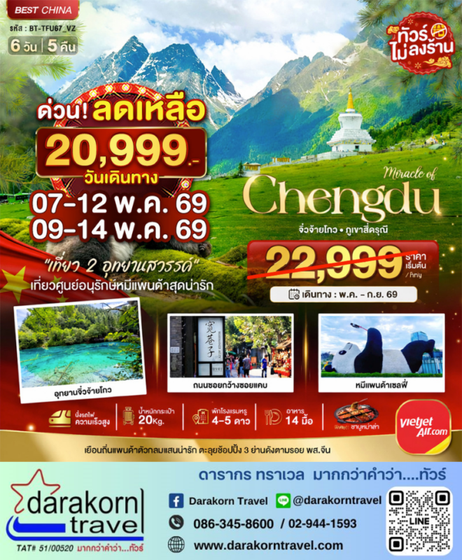 โปรไฟไหม้ ทัวร์จีน จิ่วจ้ายโกว ภูเขาสี่ดรุณี 6วัน5คืน โปรแรง ลดราคา 2000 บาท จองด่วน Posted on April 22, 2026 by Sales Darakorn Travel 22 Apr ทัวร์จีน จิ่วจ้ายโกว ภูเขาสี่ดรุณี 6วัน5คืน โปรแรง ลดราคา 2000 บาท จองด่วน ภูเขาสี่ดรุณี จิ่วจ้ายโกว หมีแพนด้าเซลฟี่ ถนนซอยกว้างซอยแคบ วันเดินทาง 07-12/09-14 พ.ค.69 จากราคา 22,999.- เหลือเพียง 20,999.- Facebook iconFacebookTwitter iconTwitterLINE iconLine Sales Darakorn Travel ทัวร์จีน เฉิงตู อุทยานภูเขาสี่ดรุณี 4วัน3คืน โปรแรง ลดราคา 2000 บาท จองด่วน ทัวร์จีน ต๋ากู่ปิงชวน จิ่วจ้ายโกว ซื่อกู่เหนียงซาน ปีเผิงโกว 7วัน6คืน โปรแรง ลดราคา 2000 บาท จองด่วน