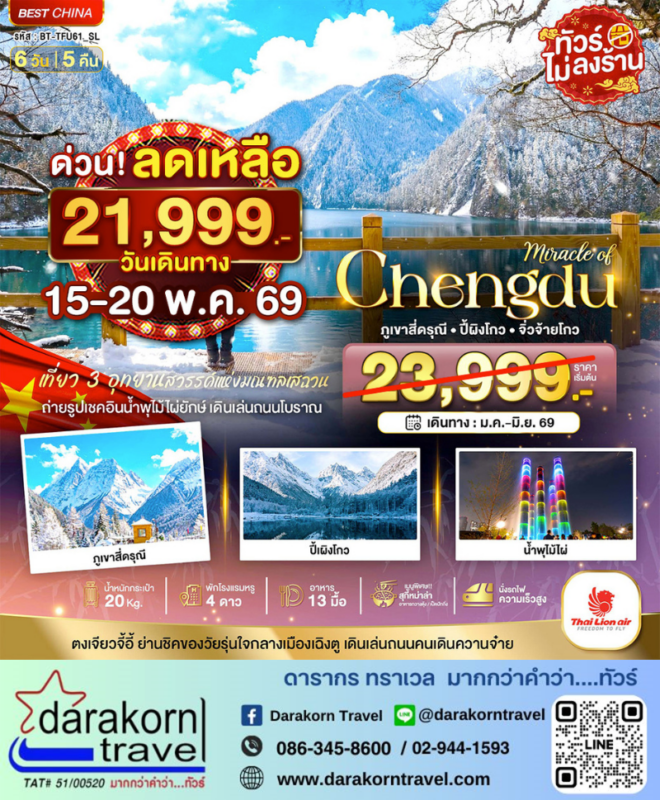 โปรไฟไหม้ ทัวร์จีน จิ่วจ้ายโกว ภูเขาสี่ดรุณี ปี้ผิงโกว 6วัน5คืน โปรแรง ลดราคา 2000 บาท จองด่วน Posted on April 23, 2026 by Sales Darakorn Travel 23 Apr ทัวร์จีน จิ่วจ้ายโกว ภูเขาสี่ดรุณี ปี้ผิงโกว 6วัน5คืน โปรแรง ลดราคา 2000 บาท จองด่วน ภูเขาสี่ดรุณี จิ่วจ้ายโกว ปี้ผิงโกว น้ำพุไม้ไผ่ วันเดินทาง 15 -20 พ.ค.69 จากราคา 23,999.- เหลือเพียง 21,999.- Facebook iconFacebookTwitter iconTwitterLINE iconLine Sales Darakorn Travel ทัวร์จีน เฉิงตู อุทยานภูเขาสี่ดรุณี 6วัน5คืน โปรแรง ลดราคา 4000 บาท จองด่วน