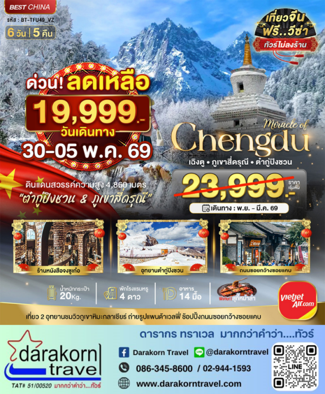 โปรไฟไหม้ ทัวร์จีน เฉิงตู อุทยานภูเขาสี่ดรุณี 6วัน5คืน โปรแรง ลดราคา 4000 บาท จองด่วน Posted on April 23, 2026 by Sales Darakorn Travel 23 Apr ทัวร์จีน เฉิงตู อุทยานภูเขาสี่ดรุณี 6วัน5คืน โปรแรง ลดราคา 4000 บาท จองด่วน สะพานหนานเฉียว จงเจียวจื้ออี้ ถนนซอยกว้างซอยแคบ ล่องเรือยาง วันเดินทาง 30เม. – 05 พ.ค.69 จากราคา 18,999.- เหลือเพียง 15,999.- Facebook iconFacebookTwitter iconTwitterLINE iconLine Sales Darakorn Travel ทัวร์จีน เฉิงตู อุทยานภูเขาสี่ดรุณี 6วัน5คืน โปรแรง ลดราคา 3000 บาท จองด่วน ทัวร์จีน จิ่วจ้ายโกว ภูเขาสี่ดรุณี ปี้ผิงโกว 6วัน5คืน โปรแรง ลดราคา 2000 บาท จองด่วน
