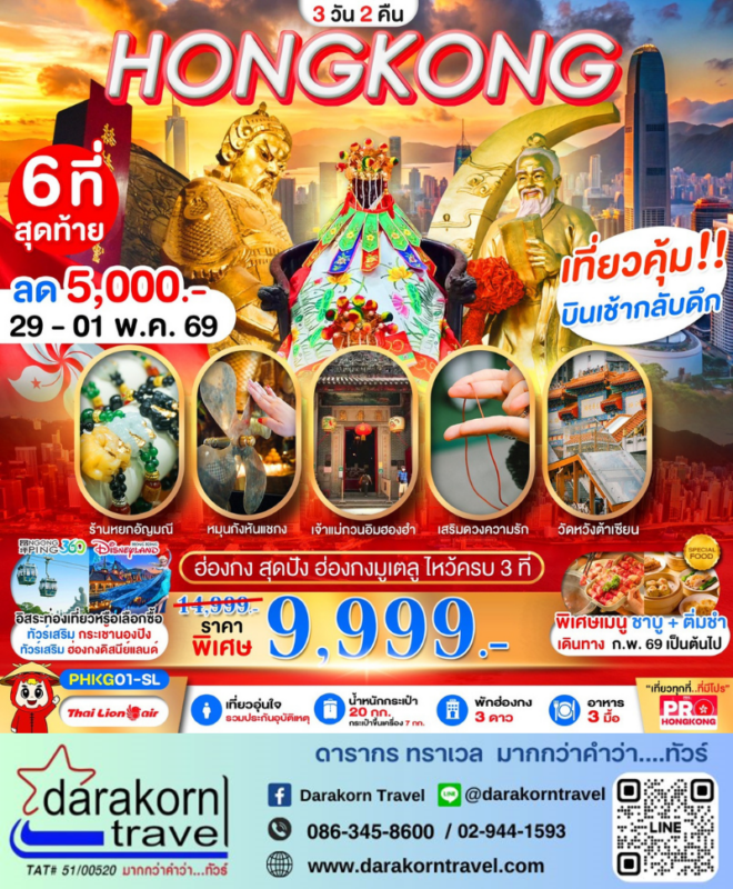 โปรไฟไหม้ ทัวร์ฮ่องกง ฮ่องกง สุดปัง ฮ่องกงมูเตลู ไหว้ครบ3ที่ 3วัน2คืน โปรแรง ลดราคา 5000 บาท จองด่วน Posted on April 27, 2026 by Sales Darakorn Travel 27 Apr ทัวร์ฮ่องกง ฮ่องกง สุดปัง ฮ่องกงมูเตลู ไหว้ครบ3ที่ 3วัน2คืน โปรแรง ลดราคา 5000 บาท จองด่วน ร้านหยกอัญมณี หมุนกังหันแชกง เจ้าแม่กวนอิมฮองฮำ เสริมดวงความรัก วัดหวังต้าเซียน วันเดินทาง 29เม.ย. – 01 พ.ค.69 จากราคา 14,999.- เหลือเพียง 9,999.- Facebook iconFacebookTwitter iconTwitterLINE iconLine Sales Darakorn Travel ทัวร์จีน ต๋ากู่ปิงชวน จิ่วจ้ายโกว ซื่อกู่เหนียงซาน ปีเผิงโกว 7วัน6คืน โปรแรง ลดราคา 2000 บาท จองด่วน ทัวร์จีน ปักกิ่ง พระราชวังต้องห้าม ฟรีเดย์ 5วัน3คืน โปรแรง ลดราคา 3000 บาท จองด่วน