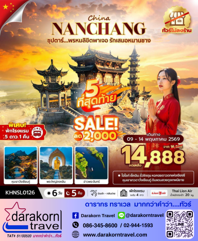 โปรไฟไหม้ ทัวร์จีน ซุปตาร์…พรหมลิขิตพาเจอรักเสมอหนานชาง 6วัน5คืน โปรแรง ลดราคา 2000 บาท จองด่วน Posted on April 29, 2026 by Sales Darakorn Travel 29 Apr ทัวร์จีน ซุปตาร์…พรหมลิขิตพาเจอรักเสมอหนานชาง 6วัน5คืน โปรแรง ลดราคา 2000 บาท จองด่วน อ่าวพระจันทร์ พระใหญ่ตงหลิน หุบเขาเทวดาวั่งเซียนกู่ วันเดินทาง 09-14 พ.ค.69 จากราคา 16,888.- เหลือเพียง 14,888.- Facebook iconFacebookTwitter iconTwitterLINE iconLine Sales Darakorn Travel ทัวร์จีน ดาวสามดวง หยานไถ ชิงเต่า 6วัน5คืน โปรแรง ลดราคา 3000 บาท จองด่วน ทัวร์จีน ซุปตาร์…สิบล้านดวงดาว ไม่ก็พราว 5วัน4คืน โปรแรง ลดราคา 6000 บาท จองด่วน
