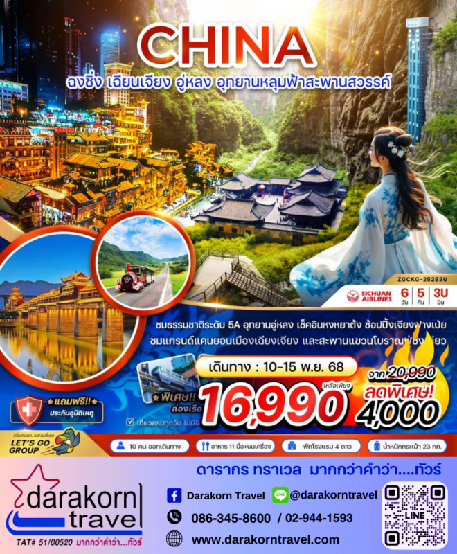 ทัวร์จีน ฉงชิ่ง เฉียนเจียง อู่หลง อุทยานหลุมฟ้า สะพานสวรรค์ 6วัน5คืน โปรแรง ลดราคาสูงสุด 4000 บาท จองด่วน