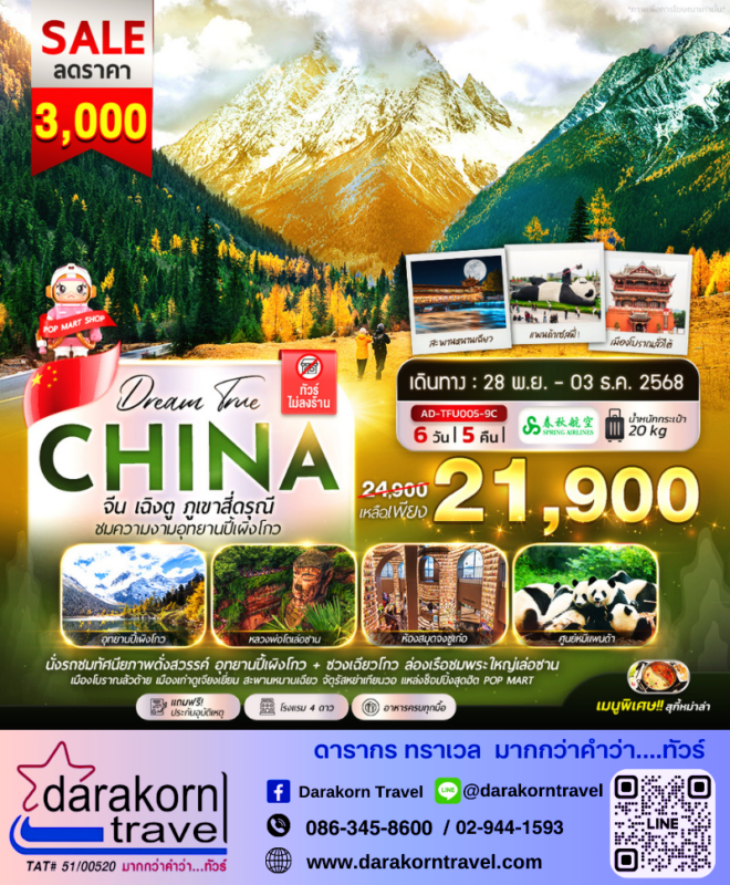 ทัวร์จีน เฉิงตู ภูเขาสี่ดรุณี ชมความงามของปี้เผิงโกว 6วัน5คืน โปรแรง ลดราคาสูงสุด 3000 บาท จองด่วน