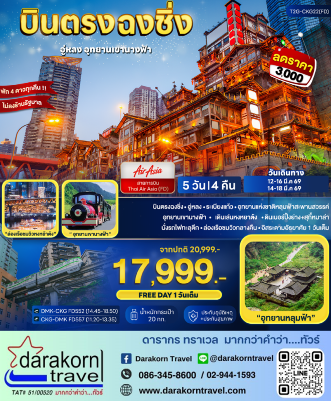 ทัวร์จีน ฉงชิ่ง อุทยานเขานางฟ้า 5วัน4คืน โปรแรง ลดราคา 3,000 บาท จองด่วน