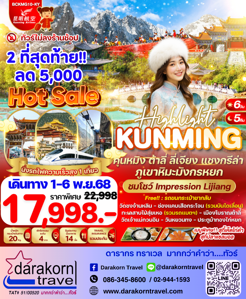 ทัวร์จีน คุนหมิง ต้าลี่ ลี่เจียง แชงกรีล่า ภูเขาหิมะมังกรหยก 6วัน5คืน โปรแรง ลดราคาสูงสุด 5000 บาท จองด่วน2ที่สุดท้าย