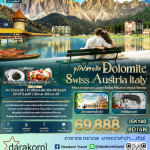 ทัวร์ยุโรป – DOLOMITE SWISS AUSTRIA ITALY Milan Innsbruck Lucern Braies Misurina Venice Verona 8วัน5คืน(EK)เดือนพฤษภาคม – กันยายน 2569