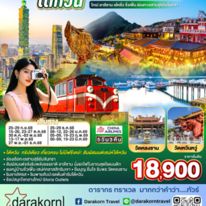 ทัวร์ไต้หวัน – ทริปเดียว เที่ยวครบ ไม่มีฟรีเดย์ ไทเป อาลีซาน เย๋หลิ่ว จิ่วเฟิ่น ล่องทะเลสาบสุริยันจันทรา 5วัน3คืน(CI)เดือนกันยายน – ธันวาคม 2568