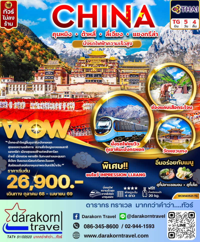 DAY4 | ภูเขาหิมะมังกรหยก (นั่งกระเช้าใหญ่ไป-กลับ) – หุบเขาพระจันทร์สีน้ำเงิน “ไป๋สุ่ยเหอ (รวมรถกอล์ฟ) – โชว์ IMPRESSION LIJIANG – พิเศษ!!นั่งรถไฟชมวิวรอบภูเขาหิมะมังกรหยก – นั่งรถไฟความเร็วสูงกลับคุนหมิง |