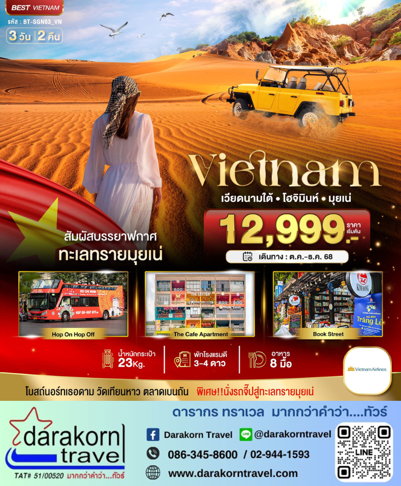 | DAY2 | ทะเลทรายแดง•นั่งรถจี๊ปสู่ทะเลทรายขาว•ร้านเยื่อไผ่•โฮจิมินห์ซิตี้•วัดเทียนหาว•Hop-on, Hop-off |
