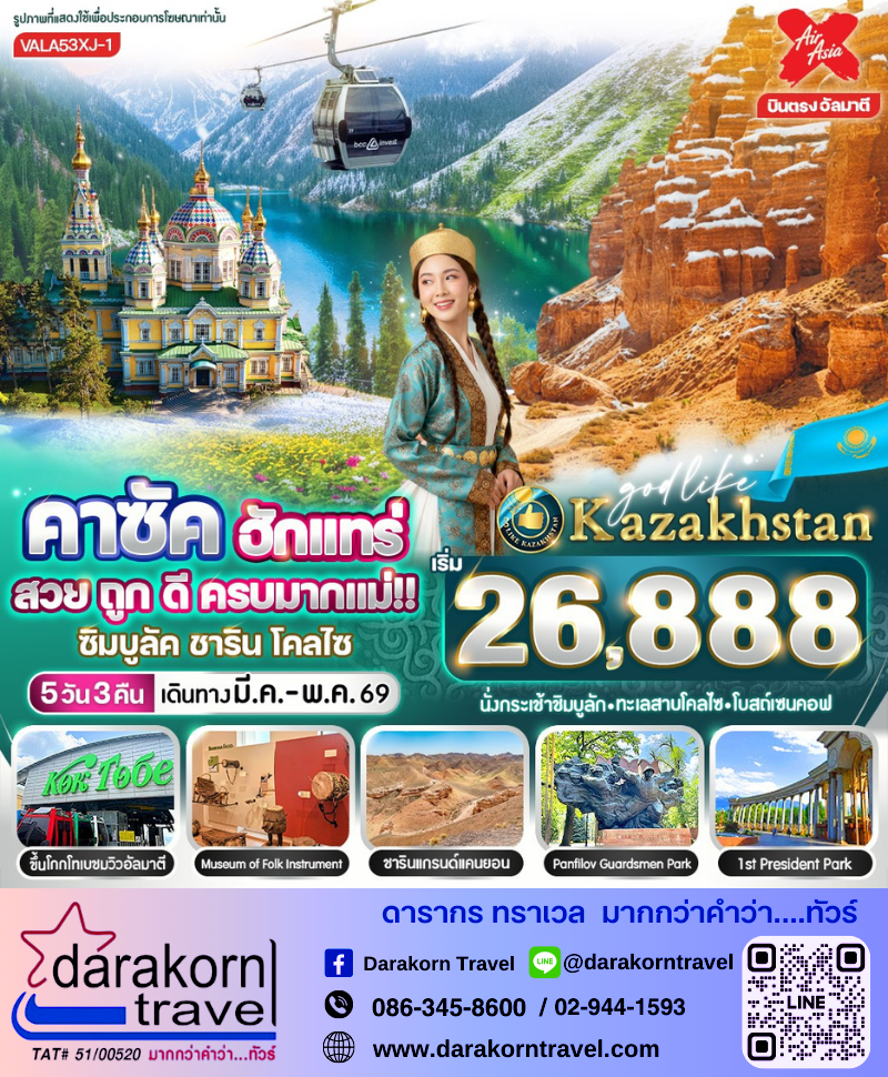 ทัวร์คาซัคสถาน - คาซัค ฮักแทร่ สวย ถูก ดี ครบมากแม่!! ซิมบูลัค ชาริน โคลไซ 5วัน3คืน(XJ)เดือนมีนาคม - พฤษภาคม 2569