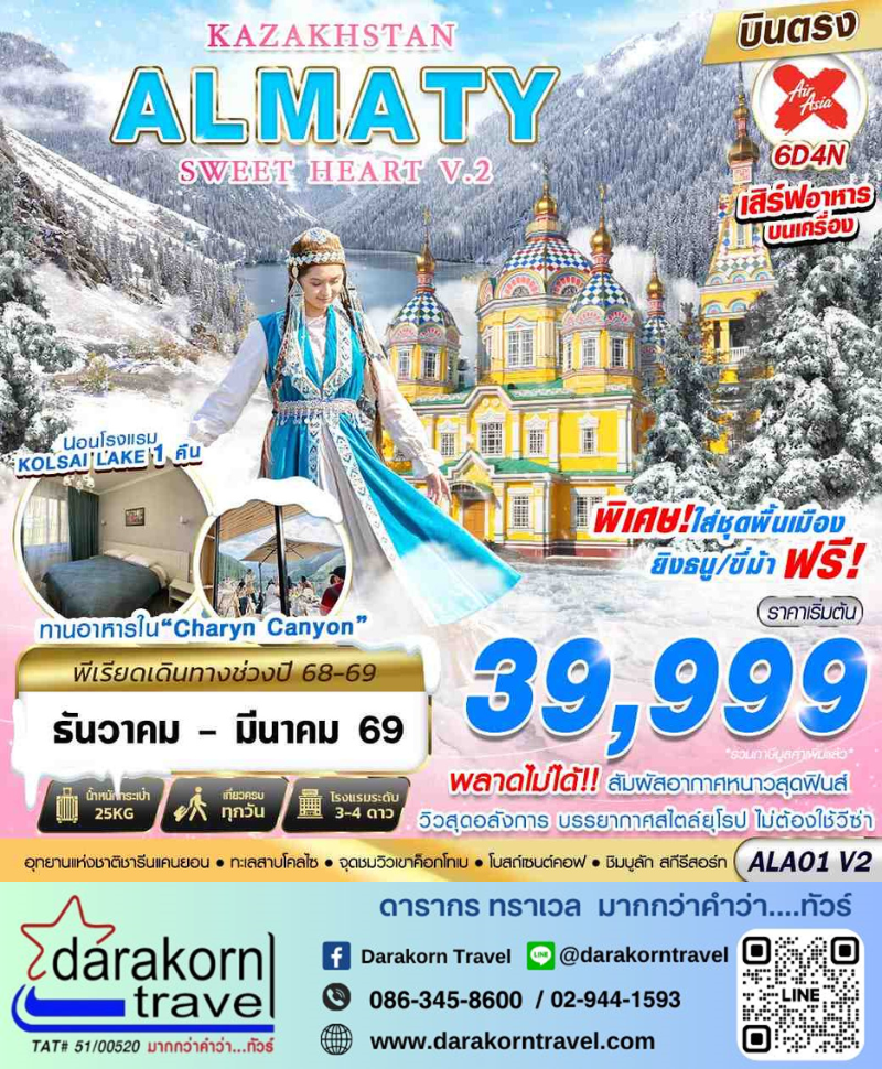 | DAY1 | กรุงเทพฯ (สนามบินดอนเมือง) – ท่าอากาศยานนานาชาติอัลมาตี – เมืองอัลมาตี |