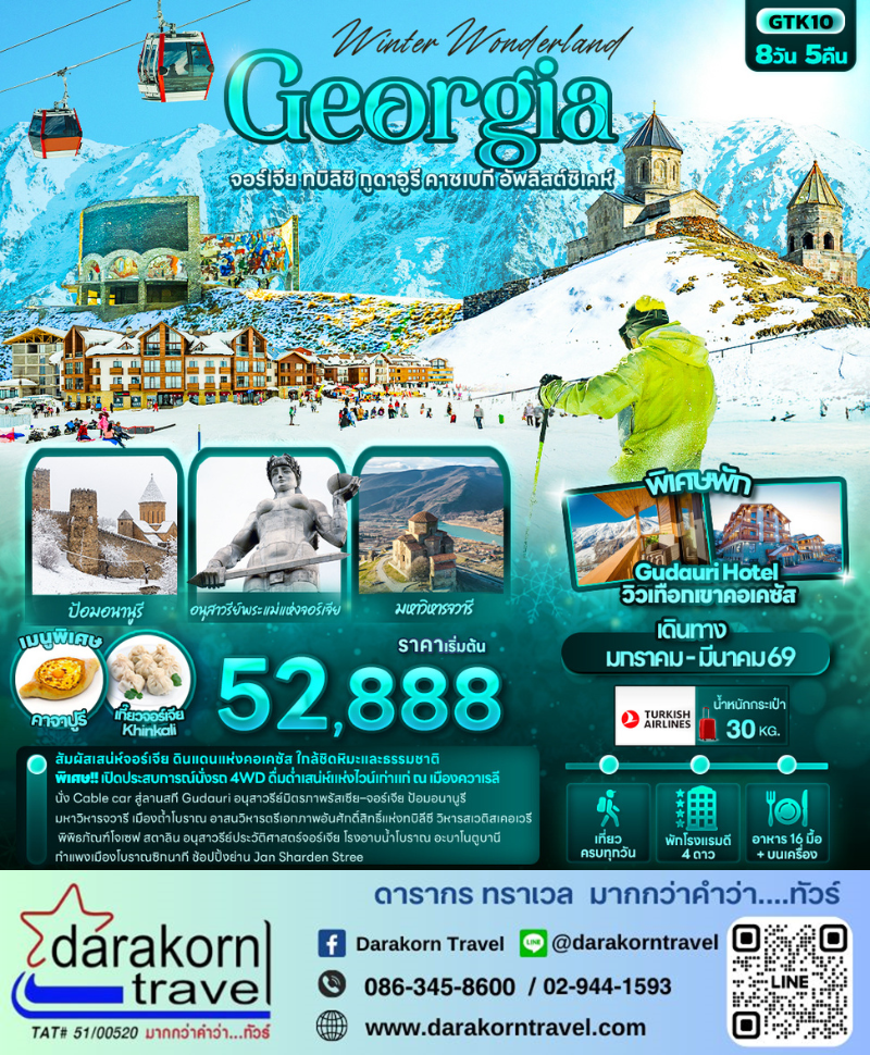 | ทัวร์จอร์เจีย – Winter Wonderland Georgia จอร์เจีย ทบิลิชิ กูดาอูรี คาซเบกี อัพลิสต์ซิเคห์ 8วัน5คืน(TK)เดือนมกราคม – มีนาคม 2569 |