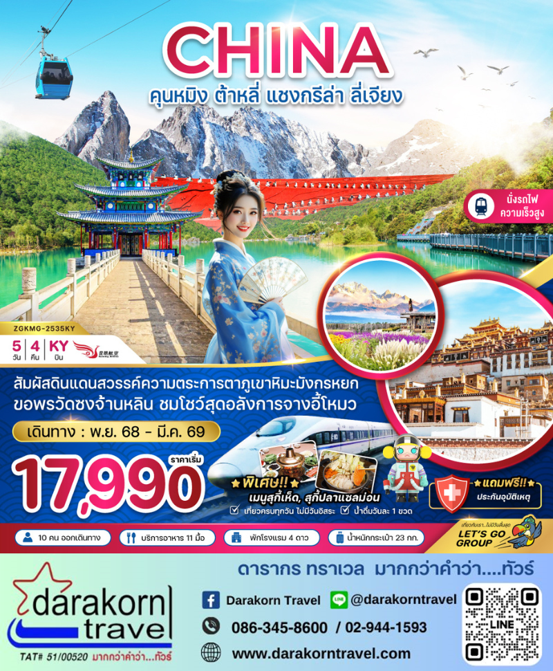 | DAY2 | นั่งรถไฟความเร็วสูงคุณหมิง-ต้าหลี่ – เมืองต้าหลี่ – วัดเจ้าแม่กวนอิม – เมืองเก่าต้าหลี่ – เจดีย์สามองค์แห่งวัดฉงเซิ่น – เมืองแชงกรี-ล่า – เมืองโบราณแชงกรี-ล่า |