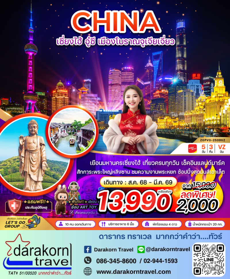 | DAY2 | เมืองอู๋ซี – พระใหญ่หลิงซานต้าฝ๋อ – เมืองเซี่ยงไฮ้- หาดไว่ทาน – ถนนนานจิง – ป๊อปมาร์ท โกลบอล แฟลกชิพ สโตร์ |