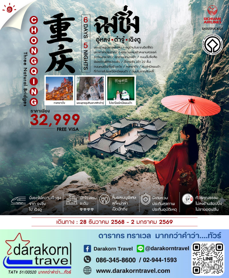 | DAY3 | ฉงชิ่ง – อู่หลง – อุทยานหลุมฟ้าสะพานสวรรค์ (รวมลิฟท์แก้ว + รถอุทยาน) – ระเบียงกระจก – อุทยานเขานางฟ้า (รวมรถไฟเล็ก) |