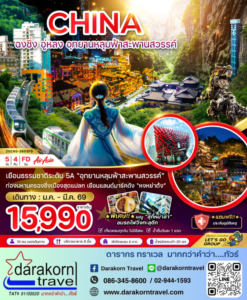 | DAY1 | สนามบินดอนเมือง – สนามบินฉงชิ่งเจียงเป่ย์ – เมืองฉงชิ่ง |
