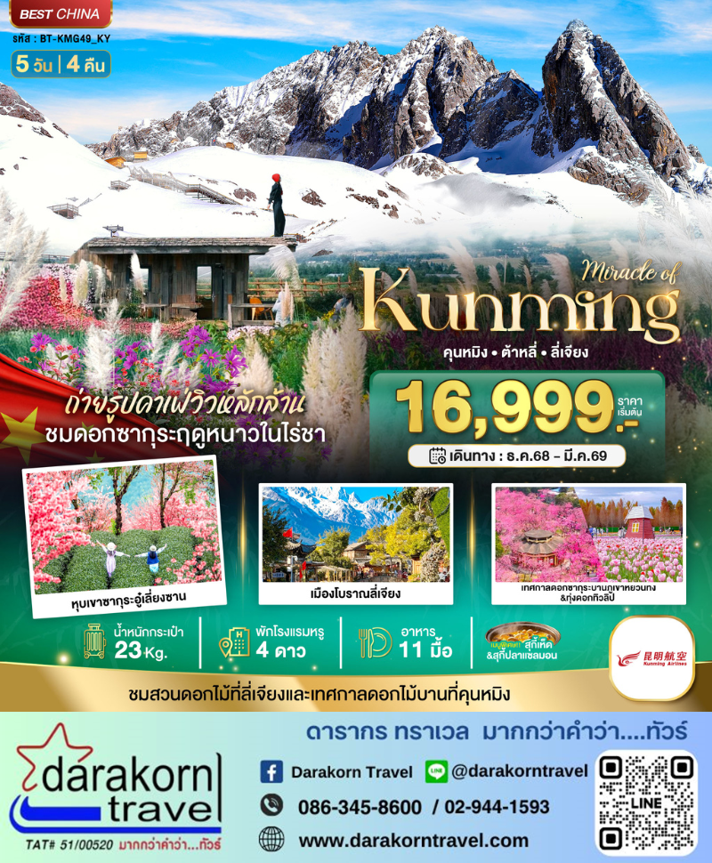 | DAY3 | หุบเขาซากุระอู๋เลี่ยงซาน (เฉพาะเดือน 12) •เมืองลี่เจียง•สระมังกรด า•เมืองโบราณซู่เหอ •หมู่บ้านชนกลุ่มน้อยไป๋ซา (เดือนอื่น) •ร้านบัวหิมะ•เมืองโบราณลี่เจียง |