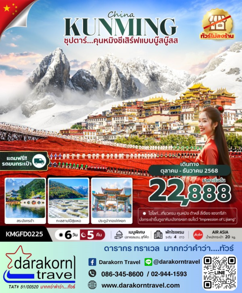 | DAY1 | ท่าอากาศยานนานาชาติดอนเมือง ประเทศไทย – ท่าอากาศยานนานาชาติคุนหมิงฉางสุ่ย ประเทศจีน – เมืองต้าหลี่ – เมืองโบราณต้าหลี่ |