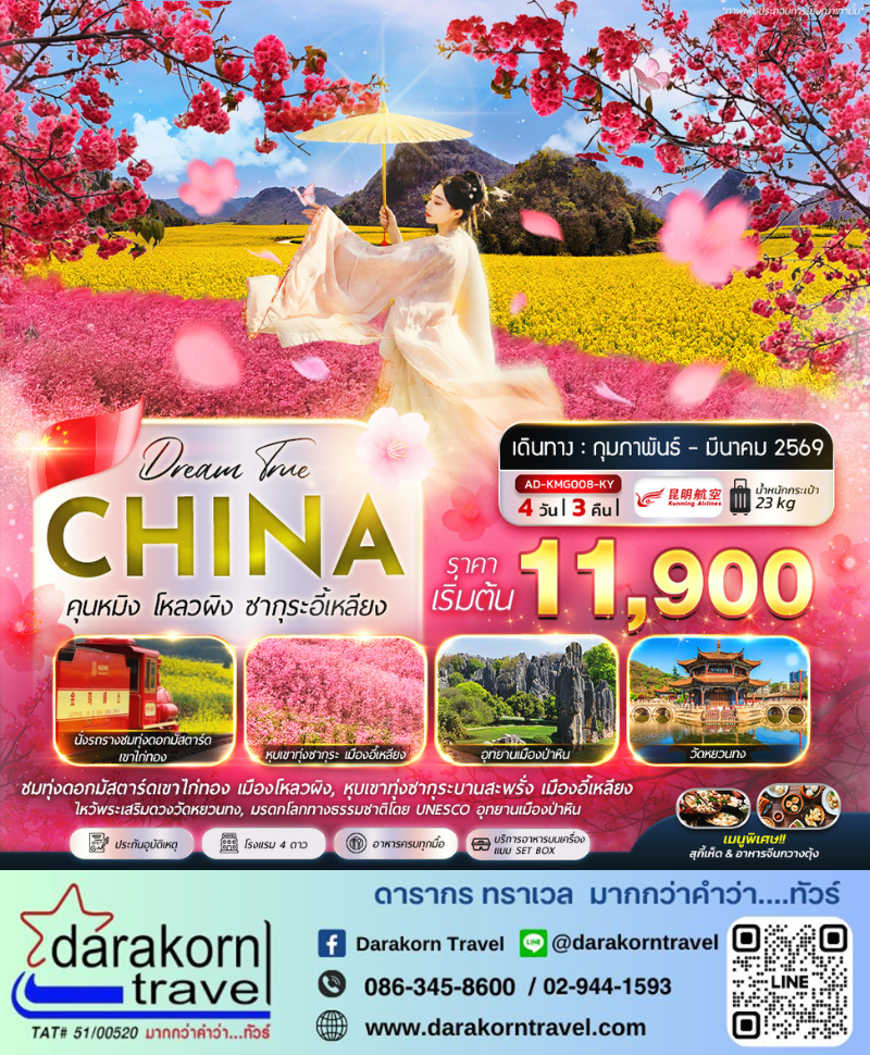 | DAY4 | วัดหยวนทง • ร้านหยก(เดือนกุมภาพันธ์ : ชมดอกทิวลิปอุทยานเหล่าหยูเหอ)(เดือนมีนาคม : ชมดอกซากุระภูเขาหยวนทง)• สนามบินคุนหมิงฉางสุ่ย • สนามบินสุวรรณภูมิ |