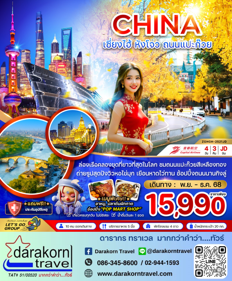 | DAY3 | เมืองหังโจว – ล่องเรือคลองขุดใหญ่ ปักกิ่ง–หังโจว – ถนนคนเดินหูปิน –ถ่ายรูปริมทะเลสาบซีหู – ถนนต้นแปะก๊วย – City Balcony Hangzhou– เอาท์เล็ต หังโจว |