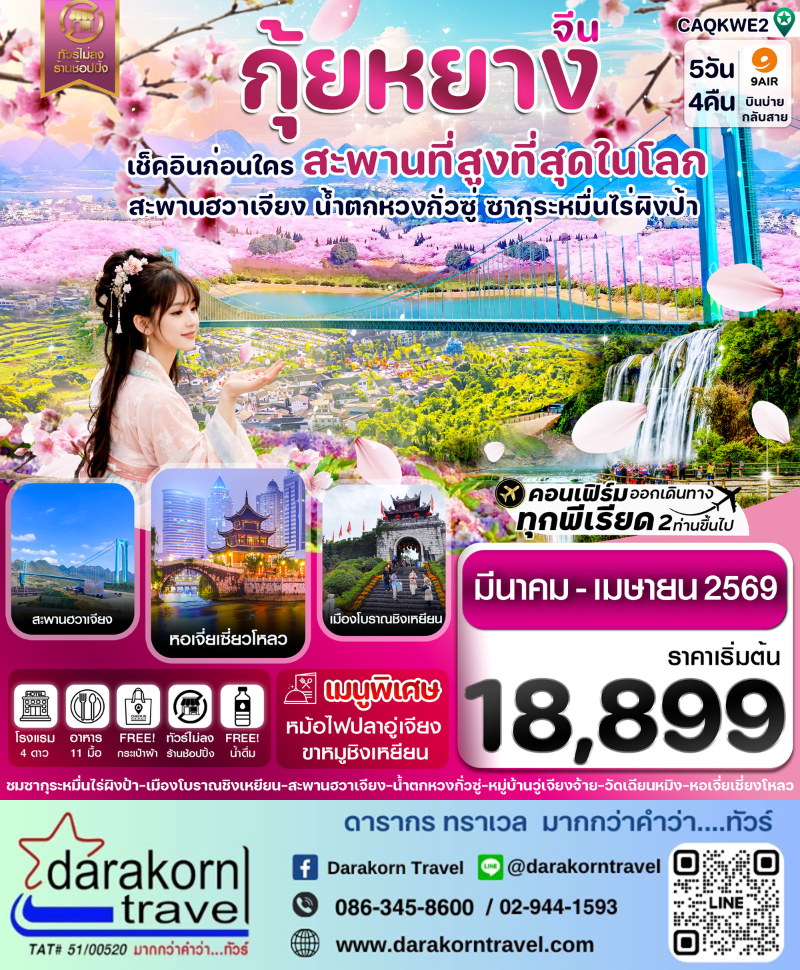 | DAY2 | อุทยานซากุระหมื่นไร่ผิงป้า(รวมรถอุทยาน) – สะพานฮวาเจียง -สะพานที่สูงที่สุดในโลก(Option สะพานกระจก+ลิฟท์)-น้ำตกหวงกั่วซู่+ชมการแสดง แสง สี เสียงอันยิ่งใหญ่ (รวมลิฟต์ขึ้น-ลง) |