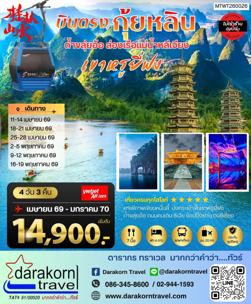 | DAY1 | สนามบินสุวรรณภูมิ–เมืองกุ้ยหลิน – เจดีย์เงิน เจดีย์ทอง |