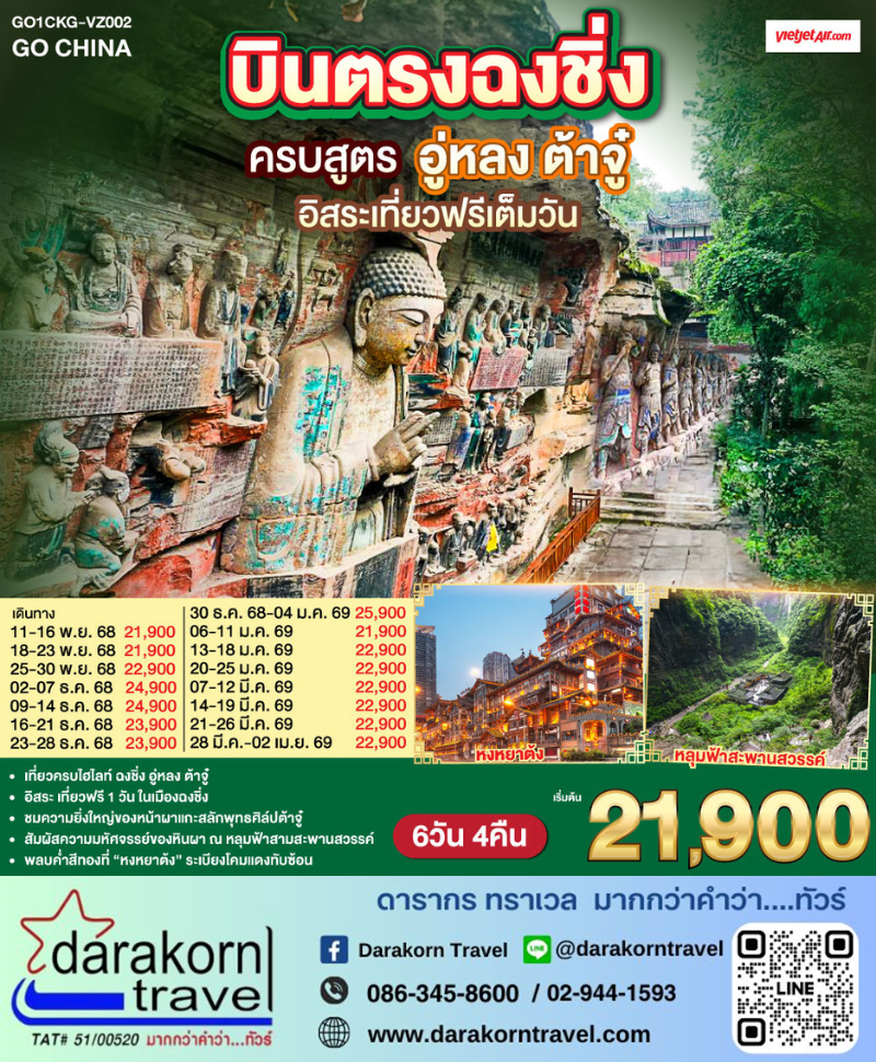 DAY2 | มรดกโลกอุทยานผาหินแกะสลักต๋าจู่ – พระไสยาสน์ปางปรินิพพาน – พระโพธิสัตว์กวนอิม – กาลจักร 6 ภพภูมิ – พระไวโรจนพุทธ – เมืองฉงชิ่ง –อาคารตะเกียบ – ไคว่ชิงโหลชั้น 1 กลายเป็นชั้นที่ 22 – ตลาดหงหยาต้ง |