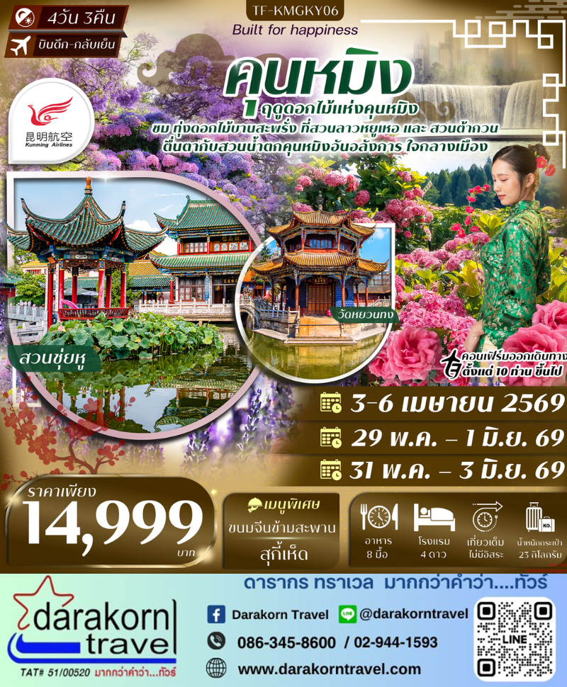 | DAY4 | วัดหยวนทง-ถนนคนเดินเก่า-ร้านบัวหิมะ-สนามบินคุนหมิง-เดินทางกลับกรุงเทพฯ |