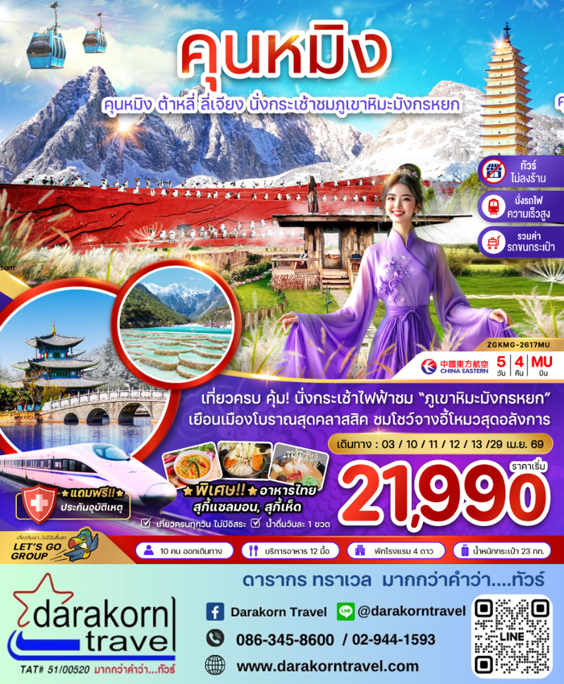 | DAY1 | สนามบินสุวรรณภูมิ – สนามบินคุนหมิงฉางสุ่ย – เมืองคุนหมิง –เมืองฉู่ฉง |