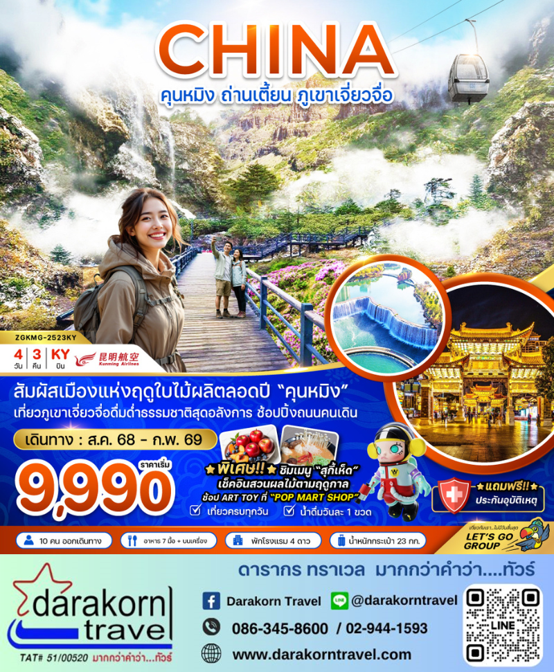 | DAY3 | เมืองคุนหมิง – ตำหนักทองจินเตี้ยน – น้ำตกเมืองคุนหมิง –ซุ้มประตูม้าทองและซุ้มประตูไก่หยก – ถนนคนเดินหนานผิงเจี่ย – POP MART |