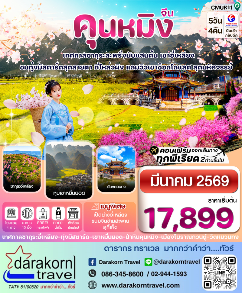 | DAY1 | สุวรรณภูมิ – สนามบินนานาชาติคุนหมิงฉางฉุ่ย – นั่งรถไปอี๋เหลียง -ชมภูเขาซากุระนับแสนต้น (ระยะเวลาบานขึ้นอยู่กับสภาพอากาศ) ไปฉีหลิน เข้าที่พัก (BKK-KMG MU9622 /07.50-11.25) |