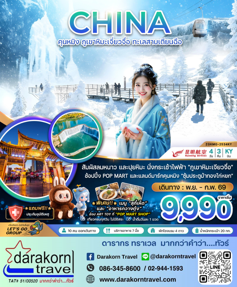 | DAY3 | เมืองคุนหมิง – สวนน้ำตกคุนหมิง – ตำหนักทองจินเตี้ยน –ซุ้มประตูม้าทองไก่หยก – ถนนคนเดินหนานผิงเจี่ย |