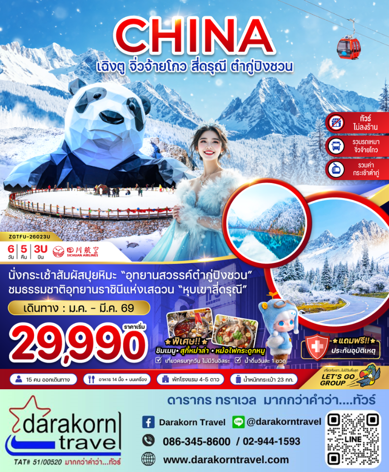 | DAY3 | เขตอุทยานต๋ากู่ปิงชวน – นั่งกระเช้าไฟฟ้าอุทยานภูผาหิมะต๋ากู่ปิงชวน –ทะเลสาบเตี๋ยซี – เมืองจิ่วจ้ายโกว |