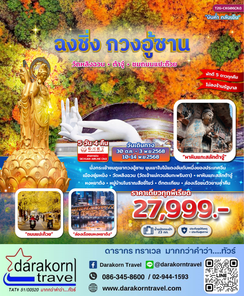 DAY5 | หมู่บ้านสือชี่โขว่ – ตึกไคว่ชิงโหล่ ชั้น22 – ตึกตะเกียบ – ถนนคนเดินเจียฟ่างเป่ย + Popmart – สนามบินฉงชิ่ง CKG-BKK 3U3771 (16.05-18.20) – สนามบินสุวรรณภูมิ |