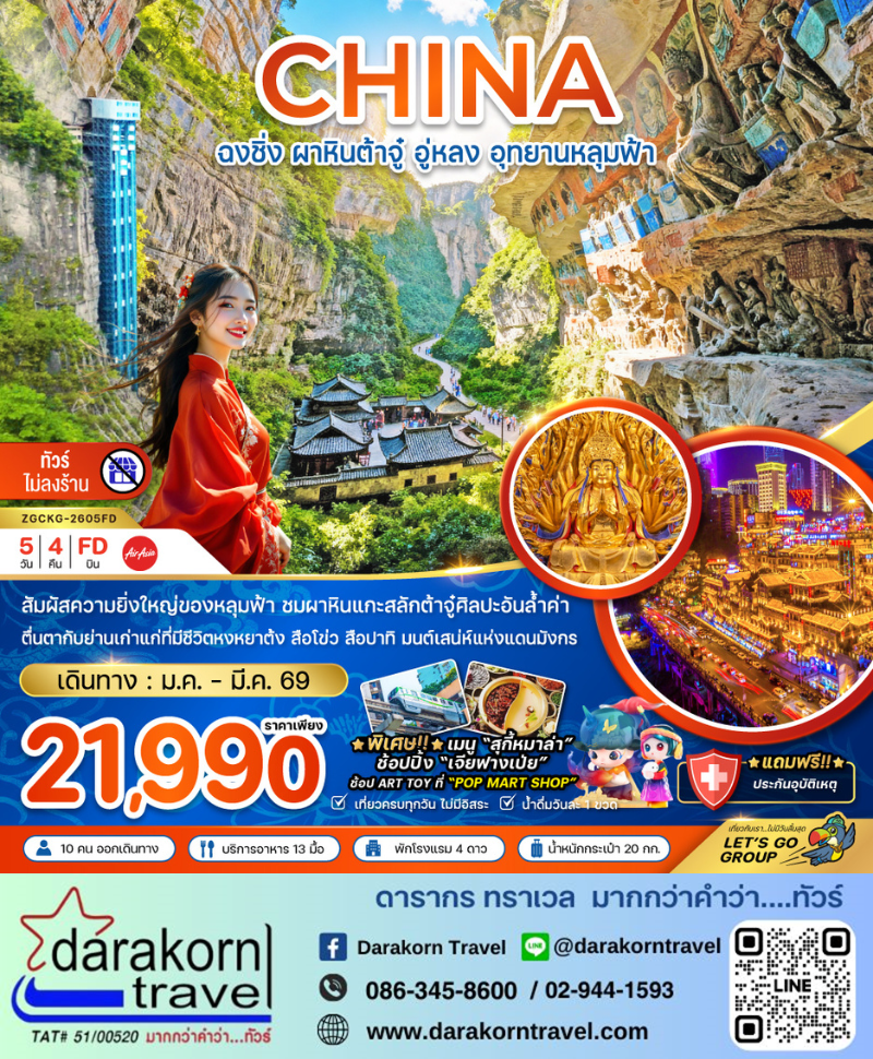 | DAY1 | สนามบินดอนเมือง – สนามบินฉงชิ่งเจียงเป่ย์ – เมืองอู่หลง |